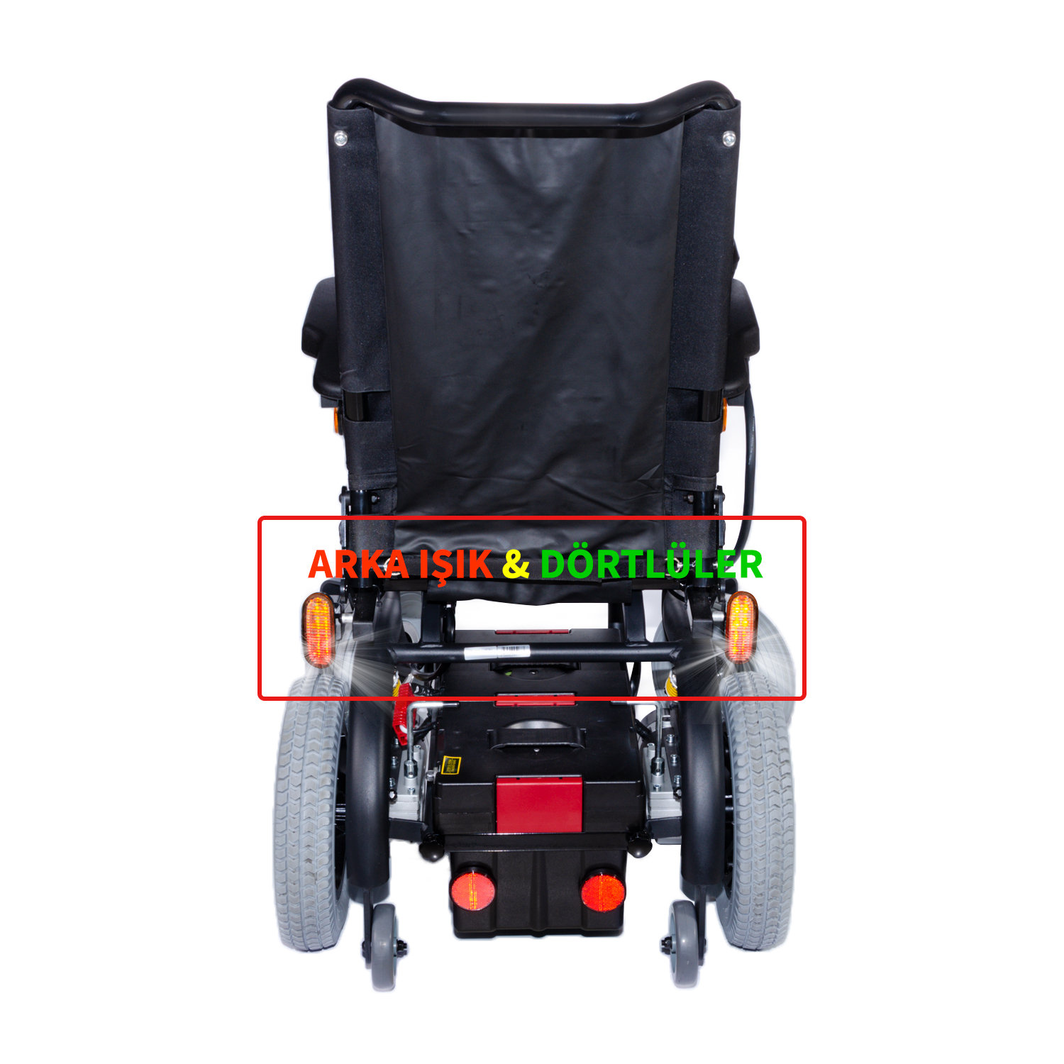 Kol koyma yerleri kullanıcı transferi sırasında çıkarılabilmekte, ayak koyma yeri ayak boyuna göre ayarlanmanın yanında çıkarılarak küçük alanlarda depolanma sağlanmaktadır. Aküsü çıkarılabilen ürünümüz, refakatçi kullanımına uygun ergonomik kolçaklara sahiptir.